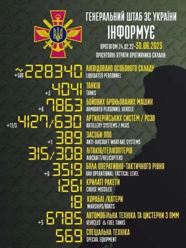 乌总参公布的昨日战果:+560人,+3辆坦克,+6辆装甲运兵车,+11门火炮,+3门多管火箭炮,+1门AD系统,6架无人机。