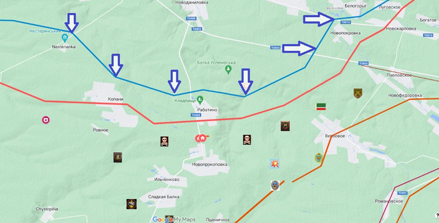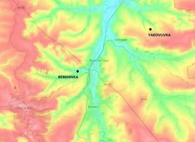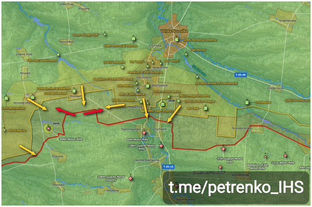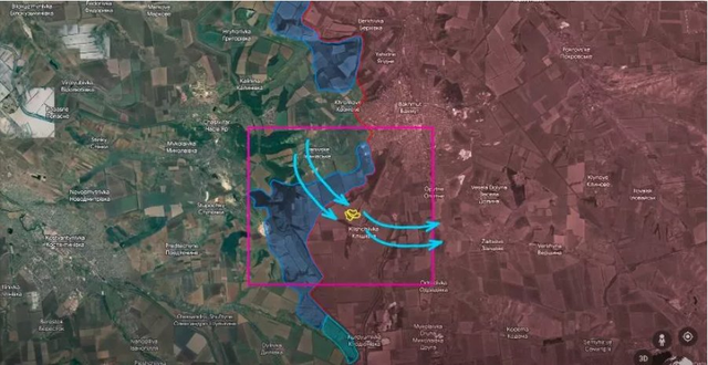 在北翼,乌克兰武装部队攻占战略高地后伸出钳子,正在从多个方向对一个大型的敌军突出部进行包围,该突出部包括Berkhivka和Yakovlivka。