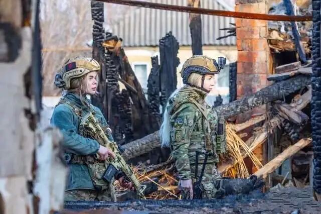 二、两个乌军小姐姐站在一座废墟的前面,那里刚刚遭到了俄军的袭击。