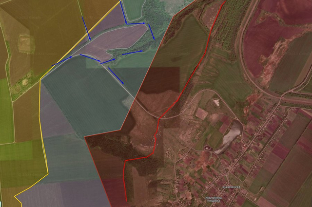 在南翼,昨日乌军继续在K村北侧向东推进,并扫清了其东面树林里的俄军阵地,目前他们距离铁路线只有约400米。