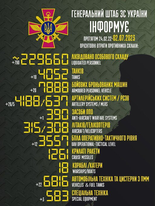 +790人,10辆坦克,20辆装甲运兵车,26个火炮系统,5个多管火箭炮系统,1个防空系统系统,12架无人机。