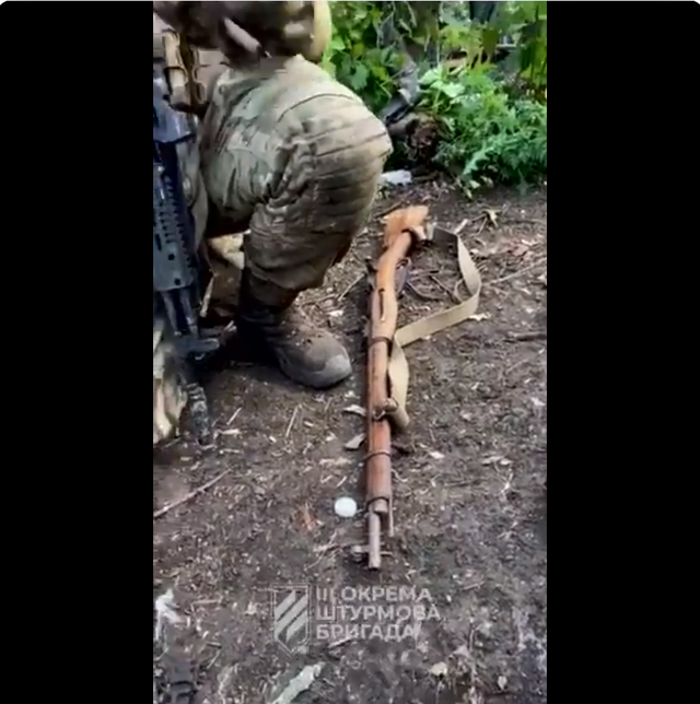 乌军抓获一名受伤的俄军士兵,并在战壕中找到了一支莫辛-纳甘步枪和其他古董武器。