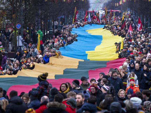 今天是立陶宛的建国日, 立陶宛人举行集会庆祝国庆,并表达对乌克兰的支持。