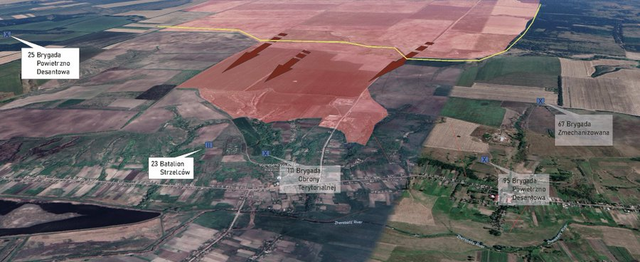 此后乌军将达芬奇营和戈诺狼营调到南翼, 第25 团增援北翼,并在夜间反动反击。经过一个晚上的激烈战斗,乌克兰部队稳定了局势并将俄罗斯军队推至黄线。