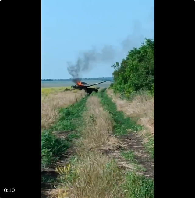 一辆尾部着火的俄罗斯T-72B3坦克在扎波罗热罗伯蒂尼附近行驶,试图开回己方阵地,最后乘员不得不跳下坦克,夺路狂奔。