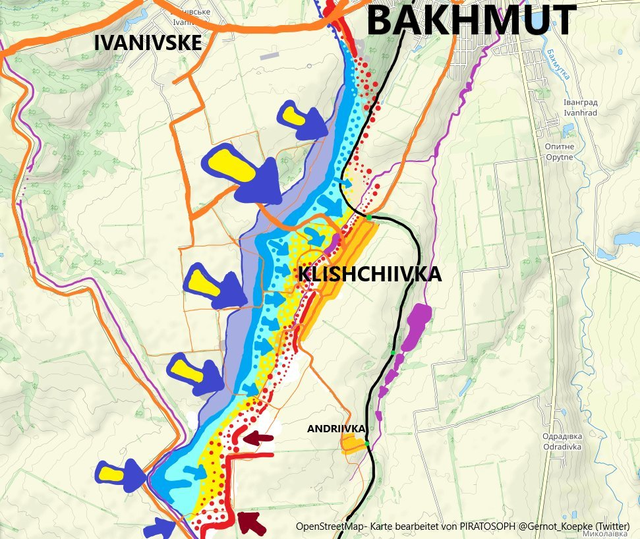 目前城市的出入口均处于乌克兰炮兵的控制之下。据估计,有 2,300 至 3,100 名俄罗斯士兵和军官被困在巴赫穆特。