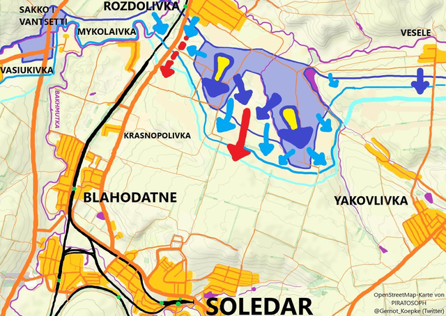 在更北面的苏勒达尔方向,乌军已经从东北方向向镇区推进,目前距离镇子边缘的太阳能雷达站只有大约1公里了。