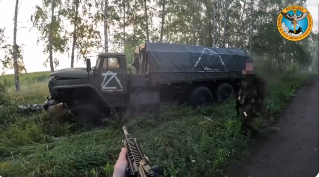 一群车臣士兵伏击了一辆俄罗斯运输卡车,消灭了车上的俄军士兵。
