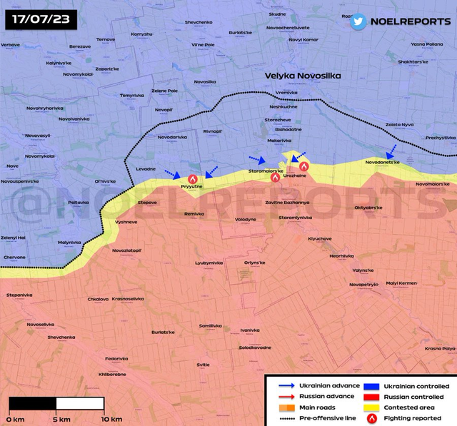 扎波罗热东线,在斯塔罗马约斯克(Staromajorske),乌克兰部队已经推进到村子的中部。南部入口的火力控制使得俄军几乎不可能调入更强大增援的部队,可以预见,该村将很快被完全解放。