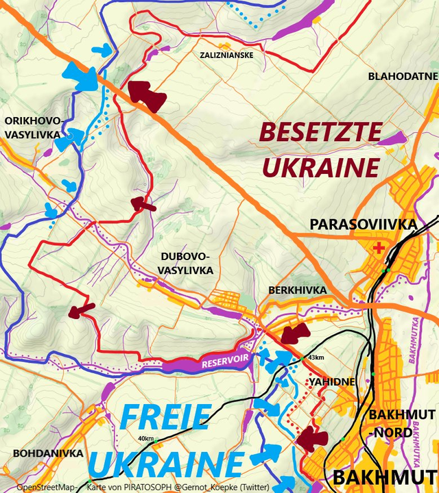 巴赫穆特南翼, K村最后一个灰色的197 号高地现已确认被乌军控制,其东南方向安德烈夫卡(Andriivka) 的山丘也在乌军手里。
