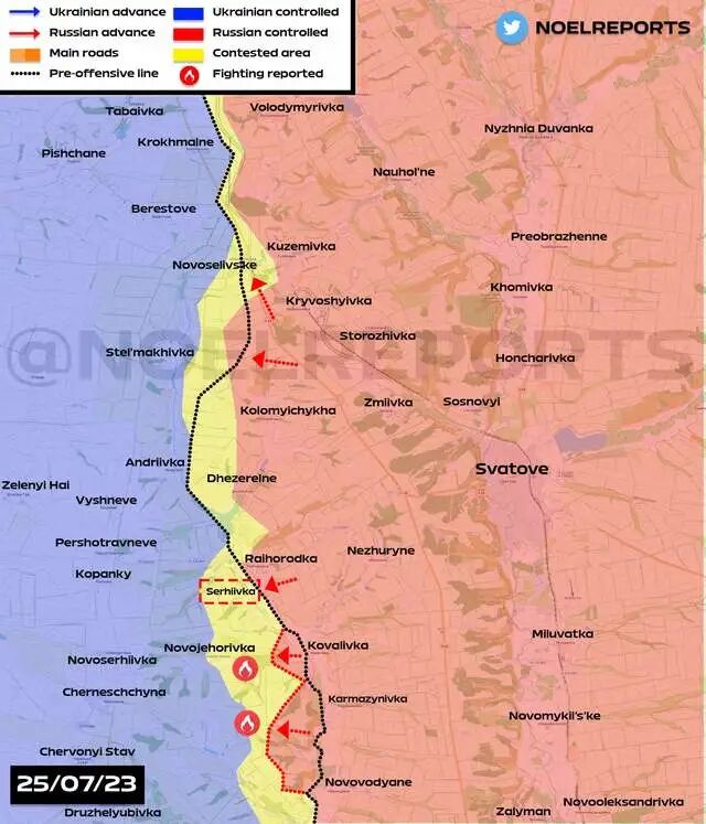 斯瓦托夫方向,俄罗斯国防部队宣布占领了Zherebets河西岸的三个村庄——谢尔盖耶夫卡(Serhiivk,战前居住人口20人)、纳迪亚(Nadiya,战前居住人口25人)和新耶戈罗夫卡村(Novojehorivka战前居住人口36人)。