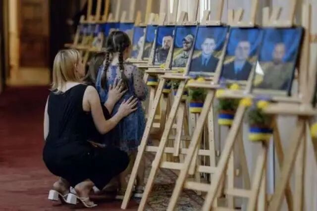 2、一位小姑娘站在父亲的画像前,缅怀为她而战的英雄。