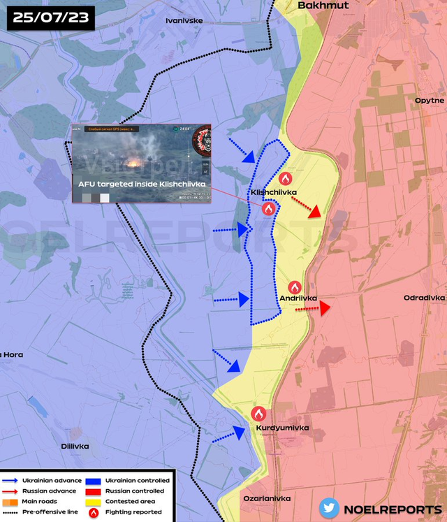 乌军在K村-安德里夫卡-库久米夫卡的全线突破,加上驻守这里的VDV精锐部队已经遭受了重创,俄罗斯人很可能不得不将宝压在K村西北的奥皮特涅(optyne)上。那里是扼守巴赫穆特南入口T-05-13公路的最后一道防线,俄罗斯第150师的第102团的部队已连续第二天向该地增援了。