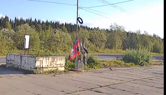 据报道,8月2日,在科米共和国的伯朝拉,一名男子带着狗将旗子从旗杆上取下,随后又放了回去。