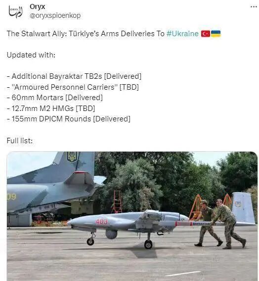 据 Oryx 称,8月4日,土耳其向乌克兰转让了一批武器和弹药,包括:- Bayraktar TB2 攻击无人机- 装甲运兵车(类型未指定)- 迫击炮口径60毫米- M2机枪口径12.7毫米-155毫米DPICM集束弹药