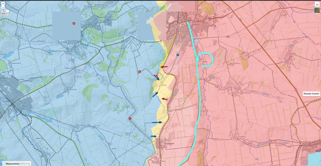 巴赫穆特方向,南翼3村目前只剩库久米夫卡仍有部分控制在俄军手里,乌军开始向Opytne推进,以切断巴赫穆特市内俄军提供补给的3条线路之一——T0513 。
