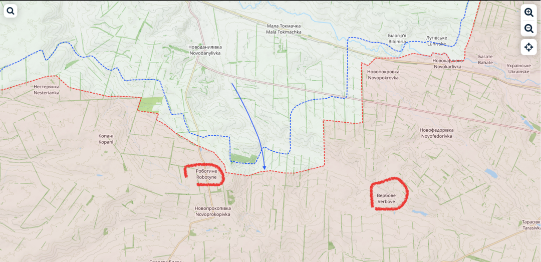 扎波罗热西线,乌军在罗伯蒂尼与Verbove之间突破了俄罗斯的第一道主防线,接下来将面临俄罗斯人在Verbove以南约5公里处的防御工事的极限测试。