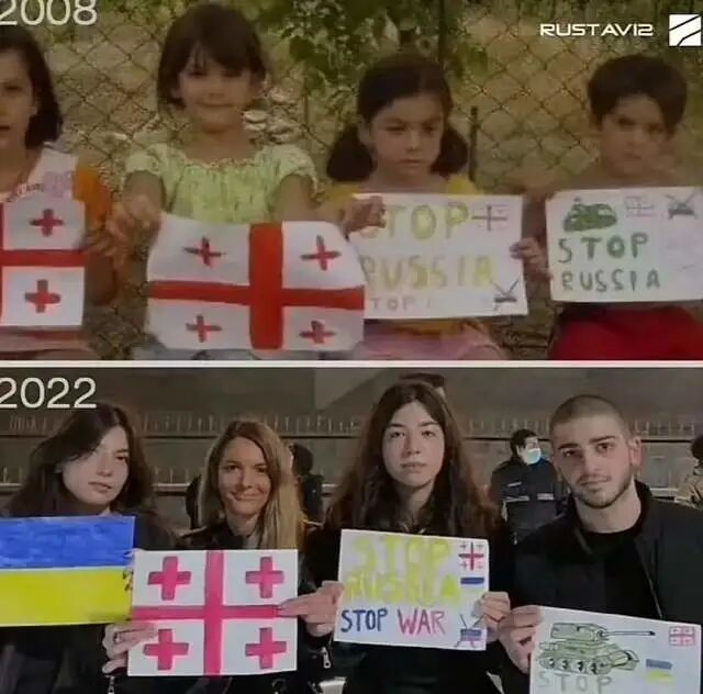 2008年,俄军入侵南奥塞梯,4个格鲁吉亚的孩子举起牌子,呼吁世界阻止俄罗斯人。