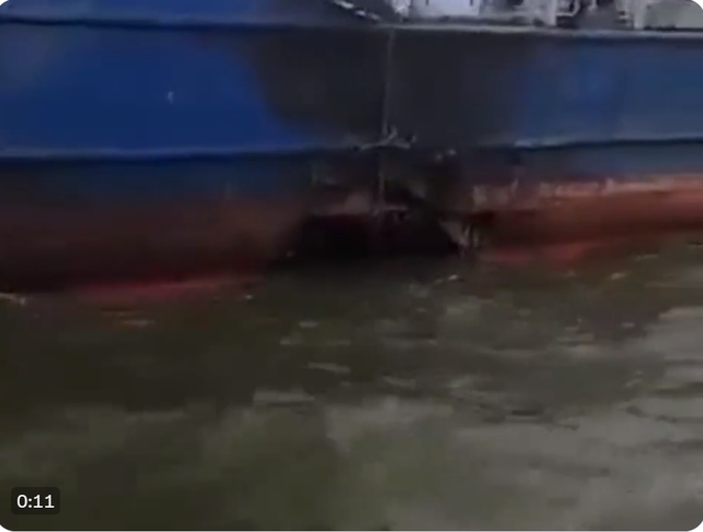 8月4日被乌克兰无人舰艇攻击而受损的俄罗斯油轮,正被拖运回港。