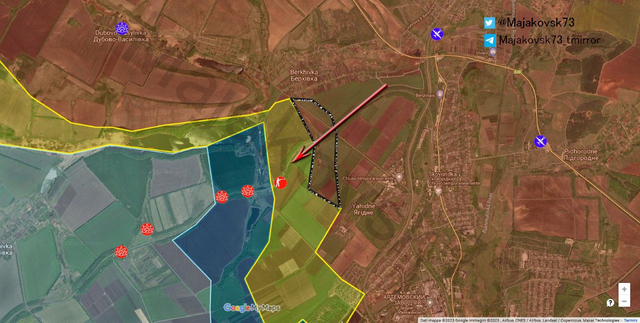 在罗伯蒂尼东面的韦尔博维(Verbove)方向, 目前主要是 堑壕战,乌军正在猛攻俄罗斯人的阵地,将火力对准了俄罗斯作战编队的深处,后者慌忙将火炮从这条线拉开6-10公里。