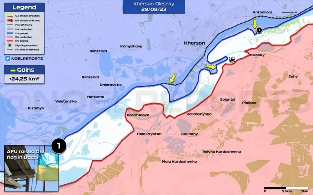 前天乌克兰国旗在达奇升起,标志着乌军正式宣告自己在左岸的存在。过去24小时,奥列斯基市西郊的战斗仍在继续。新卡霍夫卡持续被乌克兰特种部队和游击队骚扰。乌克兰博主称,在这里,打击的到来只是时间问题。
