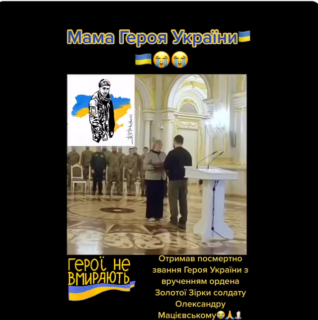 乌克兰总统泽连斯基把奖章给了他的母亲,并表示,“亚历山大,乌克兰永远不会忘记你”。
