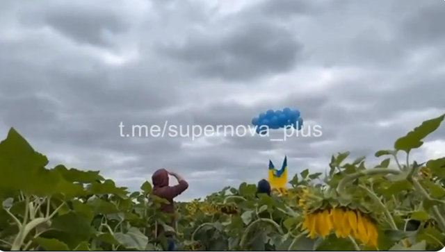 托克马克居民将乌克兰国旗绑在充满氦气的气球上,升上天空。