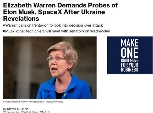 彭博社报道称,美国国会议员伊丽莎白·沃伦要求调查埃隆·马斯克在克里米亚海岸附近中断星际链路事件中的行为。她说: