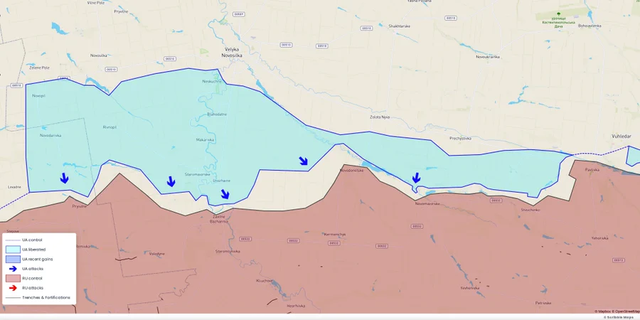 南线东战场,东翼乌军基本控制了新马约尔斯克村中心。西翼普里尤特内(Pryutne)的战斗还在进行之中,俄军在那里的防守相当严密,暂时还没有松动的迹象。