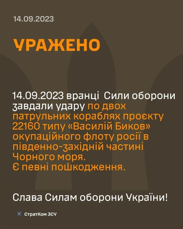 差不多在同一时间,乌克兰的海上无人机在黑海击中了两艘俄罗斯“瓦西里·贝科夫”号舰艇。美国战略通信部报告称,这两艘22160巡逻船均受重创。