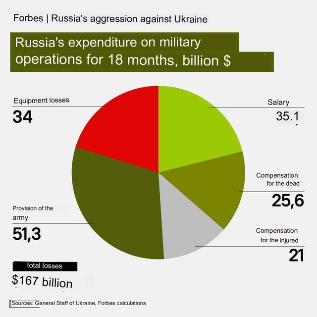 福布斯替俄罗斯人算了一笔账,自2022年2月以来,俄罗斯联邦在战争上已经花费了约1673亿美元。其中466亿美元用于伤亡赔偿,351亿美元用于工资,513亿美元用于军队补给。