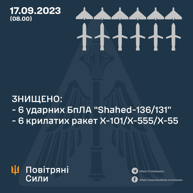 乌克兰防空部队的摧毁了其中的12个空中目标,包括全部6架Shahed-136/131型攻击无人机,以及10 枚 Kh-101/Kh-555/Kh-55 巡航导弹中的6枚。