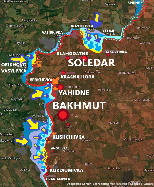 西尔斯基对巴赫穆特定下的方略是”南驱北守“,驱逐南翼的俄军,而在北部以守为主,这是近期北翼比较沉寂的重要原因。