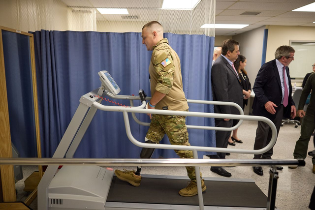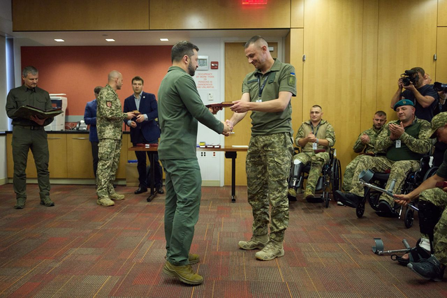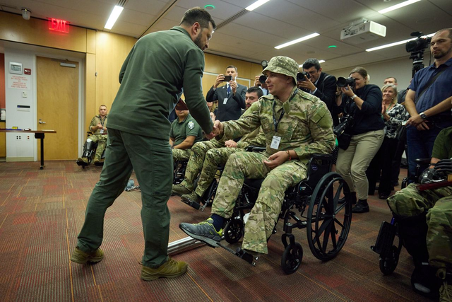 乌克兰总统弗拉基米尔·泽连斯基会见了在纽约史泰登岛大学医院接受康复治疗的乌克兰伤兵。