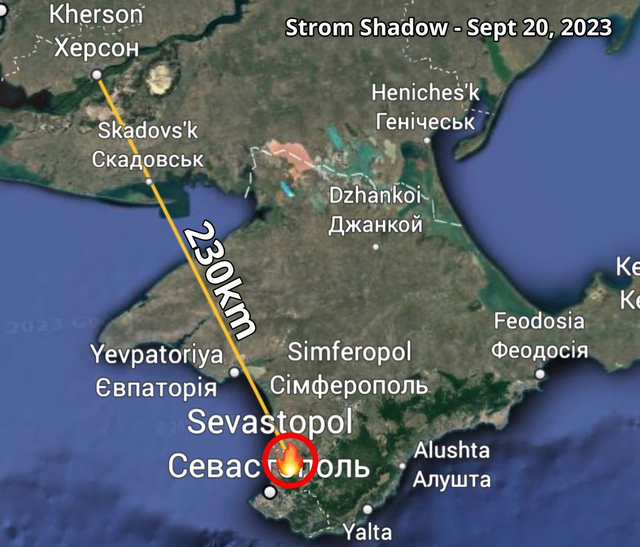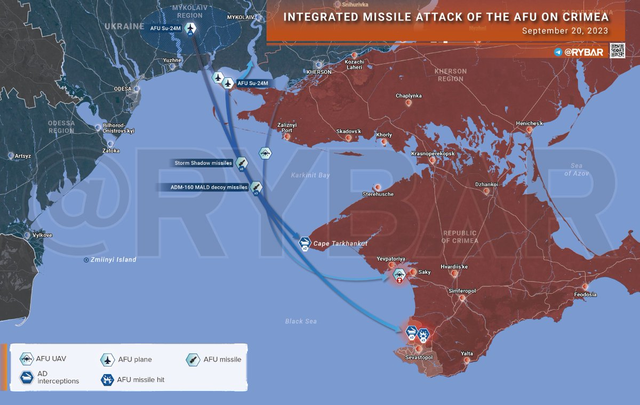 与此同时,克里米亚半岛上的防空系统开始紧张工作,并在塔尔汗库特(Tarkhankut)角和贝尔贝克(Belbek)机场附近击落了5枚巡航导弹,但有3枚风暴阴影落在了维尔赫诺萨多夫( Verkhnosadove )地区,那里是俄罗斯黑海舰队指挥所,那里距前线 230公里。