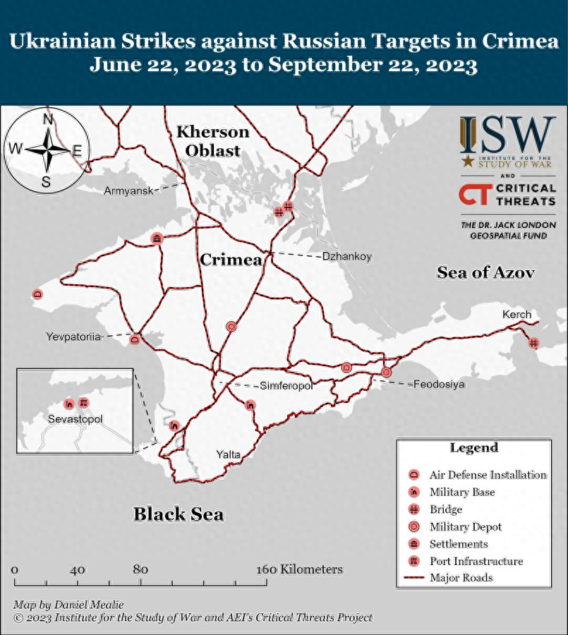 ISW昨天发布了从6月22日至9月22日之间,乌克兰对克里米亚的俄罗斯目标的打击地图。