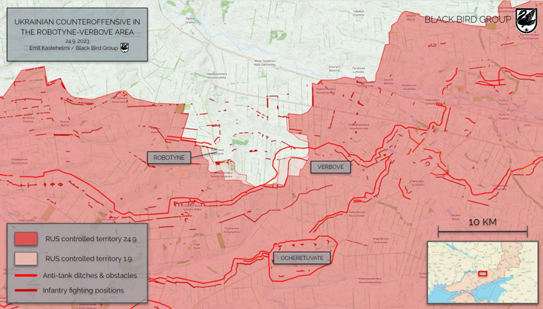 总的来说,罗伯蒂尼-托克马克一线的灰色地带正沿整个战线显著扩大,苏罗维金线的主要部分已经被严重破坏,越来越多的乌军蜂拥通过突破口。俄军试图使用炮火来封堵突破口以阻止乌军继续涌入,但却被乌军的集束炮弹压制,反倒因为暴露炮位而遭到沉重打击。
