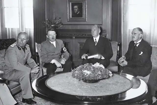 1938年9月29日至30日,英国、法国、纳粹德国、意大利四国首脑——张伯伦、达拉第、希特勒和墨索里尼,共同签订了臭名昭著的《慕尼黑协议》——英、法两国为避免战争爆发,牺牲捷克斯洛伐克的利益,将苏台德区割让给了纳粹德国。