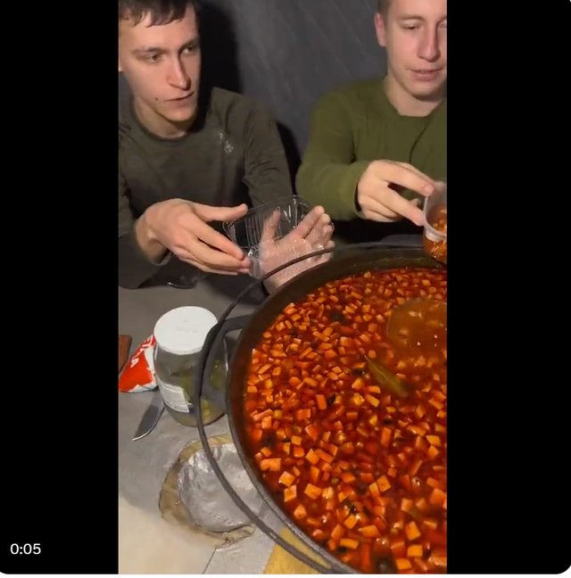 乌克兰军人做的大汤, 看着有点像麻辣火锅。