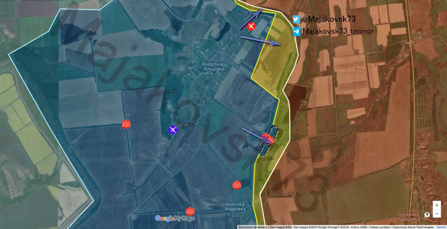 在南翼,乌军从前天夜间起开始攻击位于T0513公路(巴赫穆特-霍尔利夫卡)上的奥德拉迪夫卡村,目前战斗集中在铁路交叉线上。 一旦乌军解放了奥德拉迪夫卡村,库久米夫卡的俄罗斯部队将面临巨大风险。