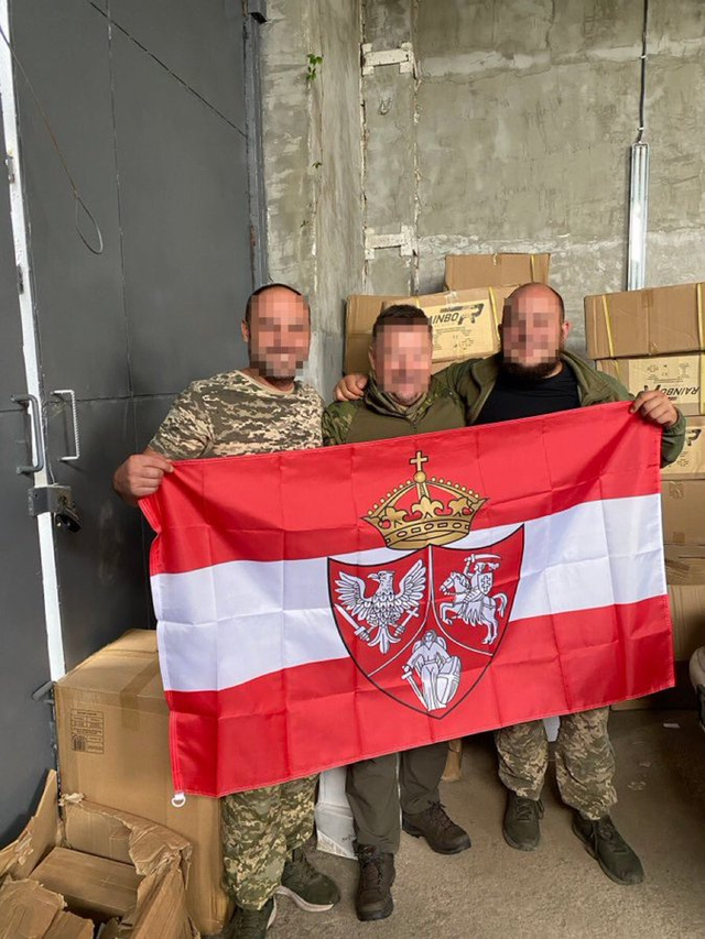 波兰,白俄,立陶宛志愿者展示复制的历史时期的反沙俄联盟旗帜。
