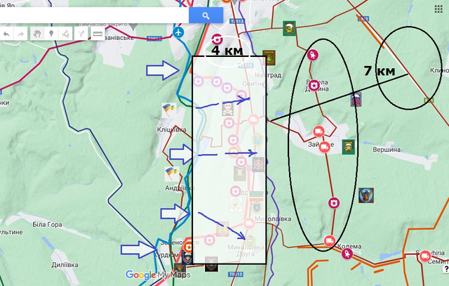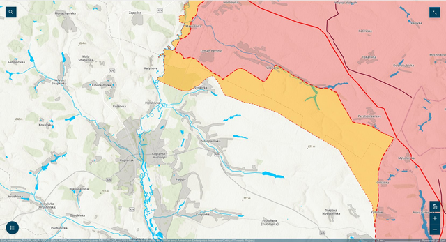 总体而言,在T0513公路的这一段,现在最危险的就是奥德拉里夫卡的俄罗斯人,因为西部的库久米夫卡的俄罗斯人自身难保,根本无法支援,而东部眼看要被切断和奥皮特内的联系了,本来可以退守T0513后面的Zaitseve,但那个岔路口也已经在被攻击中了。唯一有希望的只有从M03公路过来的增援部队,但是M03公路现在也在乌克兰的炮火控制下。