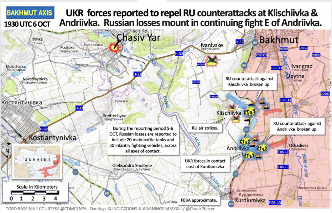 与此同时,乌克兰炮兵击中并摧毁了科德马以北的一个大型俄罗斯突击队以及装备和运输车辆,还摧毁了俄罗斯军队在扎伊采夫的一门大型 120 毫米迫击炮以及一个突击纵队及其装备。