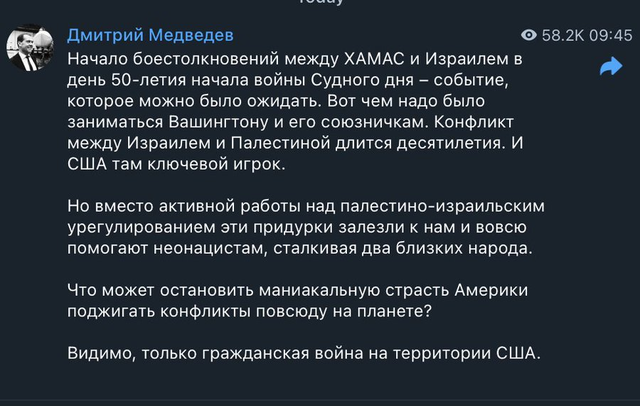 梅德韦杰夫第一时间发贴庆祝,并指责哈马斯的进攻,是美国引起的。