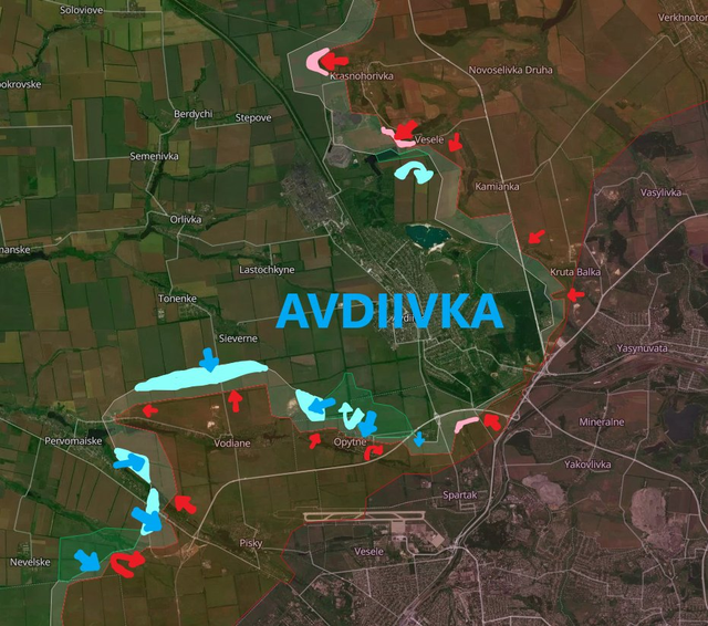 截至目前,作为俄军主攻方向的阿夫迪夫卡北部的 Stepove 定居点,以及南部的Optyne到Vesele定居点之间的区域,战斗仍在继续。