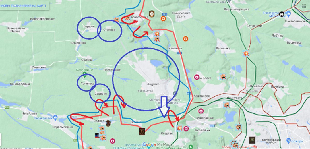 在阿夫迪夫卡南翼,俄军在正面进攻失败之后,正从H20公路的Kastanovehe T0505公路的Spartak两路夹击乌军阵地,虽然强度明显下降。