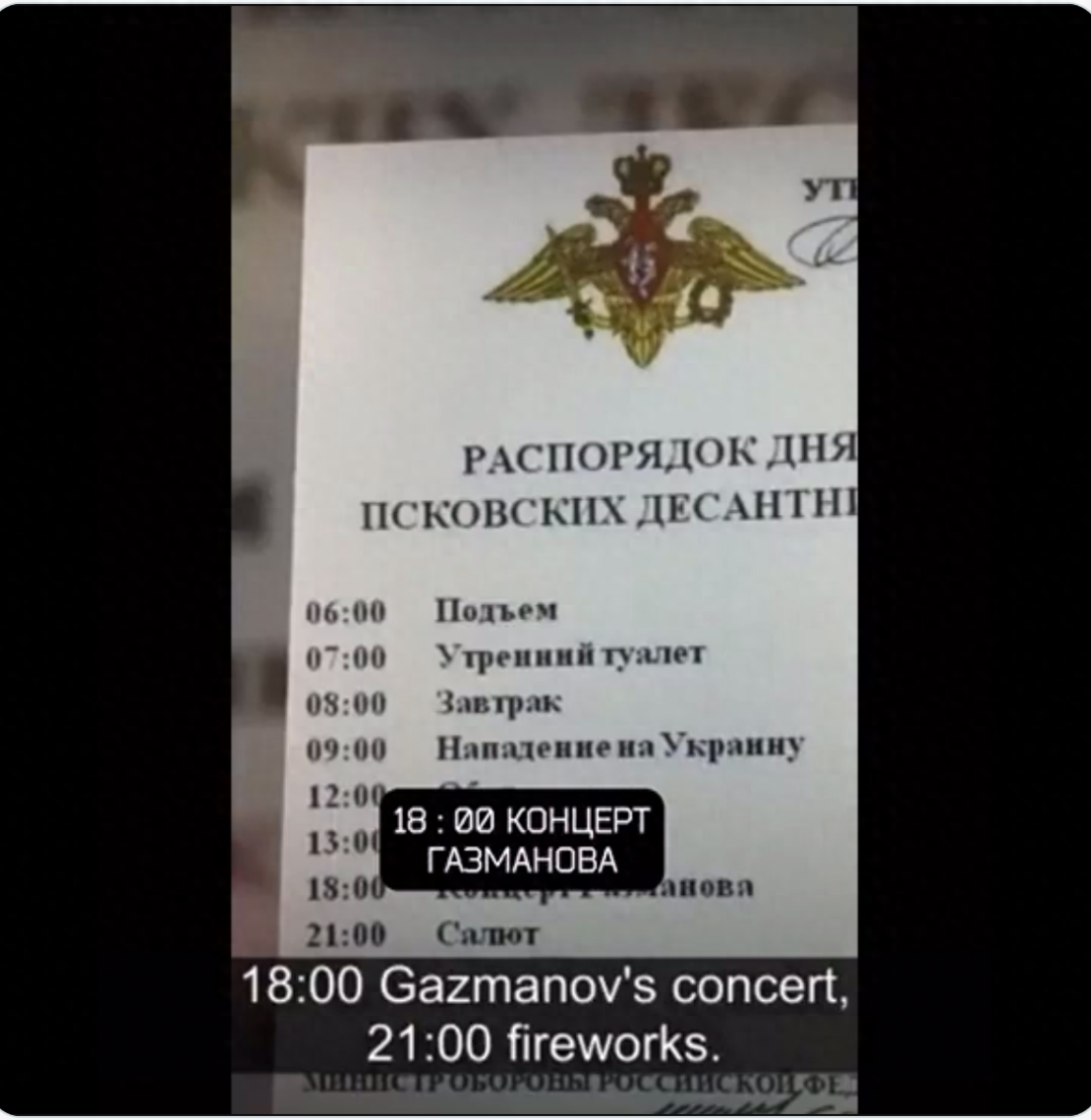 俄罗斯电视台曝光的,俄罗斯全面入侵乌克兰的第一天的计划表。俄罗斯国防部命令入侵军:6点起床 ,7点吃饭, 8点上厕所,9点进入乌克兰,下午1点在基辅吃午饭。。。