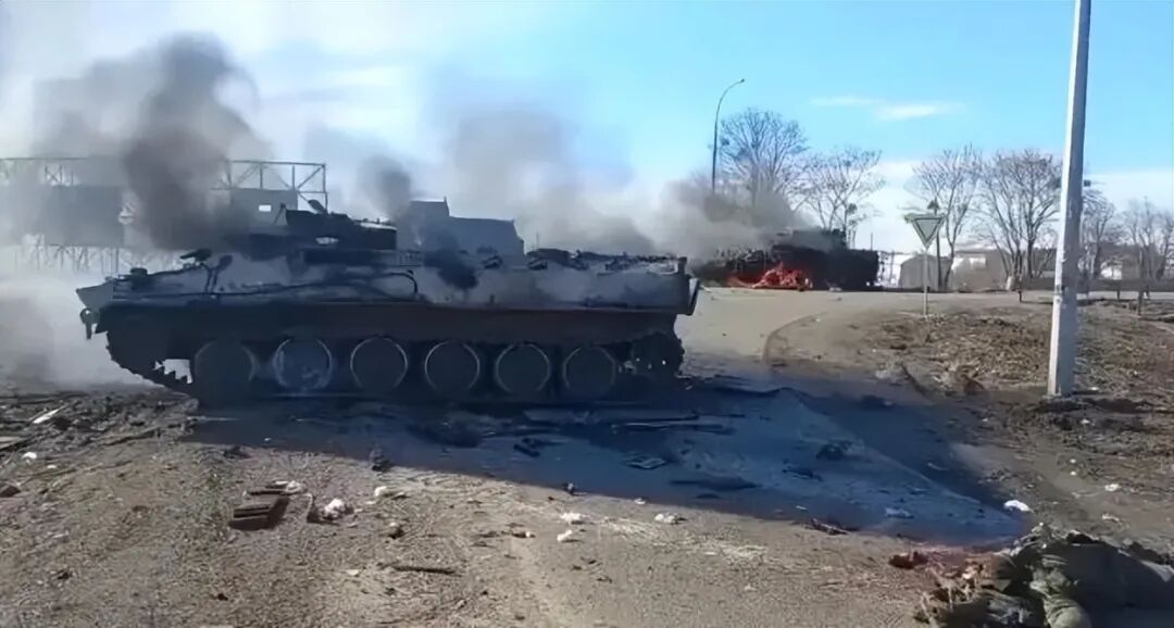 俄军的T-72主力坦克,变成一堆焦黑的废铁晾在路边。