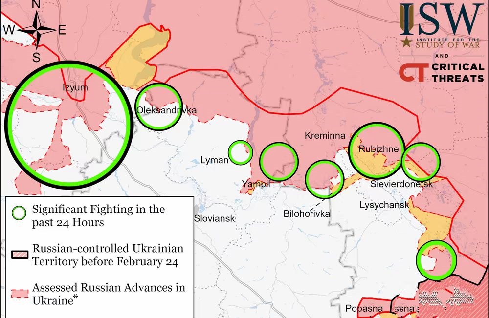 根据俄军的消息,他们已经完成了针对顿巴斯地区波帕斯纳亚的行动,突破了乌军的纵深防御,此外,俄军还在莱曼(Lyman)等多个地方(见下图黑绿圆圈标示)对乌军阵地发起攻击,我此前曾经多次提到,他们的目标是要与伊久姆突出部的俄军一道,围攻并占领斯拉夫扬斯克,完成分割包围乌东乌军的战略构想,为顿巴斯战役锁定胜局。