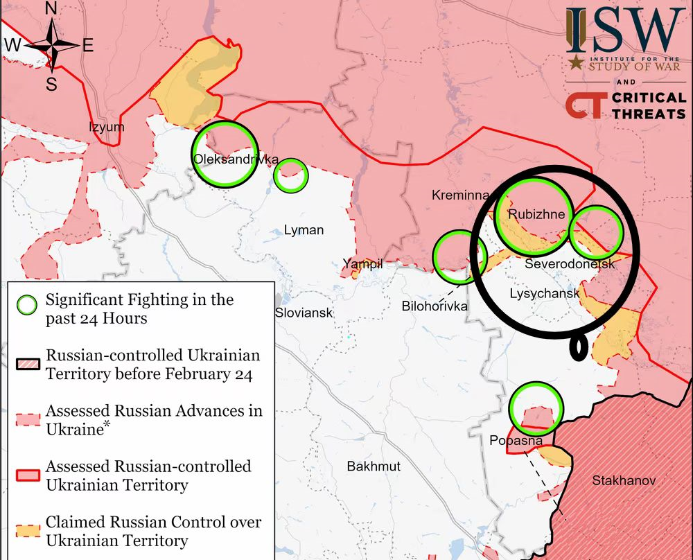 鉴于目前俄军占领了卢比什内,并在塞韦罗涅茨克郊区的沃沃沃迪夫卡取得了一定的进展,我推测伊久姆之俄军很可能向此方向(下图黑色圈所示)调动,合兵一处,自西向东进攻。